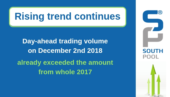 Day-ahead trading volume already exceeded the amount from the day-ahead trading volume in the entire 2017. More exactly, on December 2nd day-ahead trading volume reached 6,83 TWh. Total trading volume for this period is already well beyond 7 TWh and now stands at 7,11 TWh.